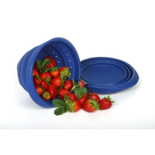 - Top quality fine mesh makes this strainer set as ideal for skimming light stock & fruit pulp as it is for draining super heavy loads of pasta and other weighty food materials.- Strong 15 lb stainless steel construction combined with an attractive stylish look makes these fine mesh strainers perfect for both professional kitchen performance and optimal kitchen appearance.- Convenient hanging holes on each of the fine mesh strainers make for quick and easy storage / access, on home and commercial kitchen storage racks.- Long handles on these worry-free stainless steel fine mesh strainers leave you assured that these strainers are as safe in a dishwasher as they are over a burning stove. - Enjoy hands-free straining using the broad, mirrored brims that comfortably sit on top of pots and other similar broth and fluid catching objects.the Norpro Blue Silicone 7.5 Inch Knockdown Colander Versatile and engineered for superior drainage, this product offers everything you need from a space saver kitchen strainer: wash or rinse fruits, vegetables, berries, herbs, meats and more. Drain pasta, rice or canned foods. 6-quart capacity makes large cooking jobs go faster. Optimal performance characteristics tested and certified. Norpro Blue Silicone 7.5 Inch Knockdown Colander is best for youYou'll love this collapsible, silicone colander. This silicone colander was design for space saving. It knocks down for easy storage and cleans up nicely and is heat resistant to 500 F/260 C. Dimensions 7 1/2-inch diameter.