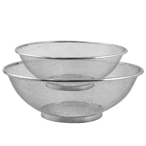 - Top quality fine mesh makes this strainer set as ideal for skimming light stock & fruit pulp as it is for draining super heavy loads of pasta and other weighty food materials.- Strong 15 lb stainless steel construction combined with an attractive stylish look makes these fine mesh strainers perfect for both professional kitchen performance and optimal kitchen appearance.- Convenient hanging holes on each of the fine mesh strainers make for quick and easy storage / access, on home and commercial kitchen storage racks.- Long handles on these worry-free stainless steel fine mesh strainers leave you assured that these strainers are as safe in a dishwasher as they are over a burning stove. - Enjoy hands-free straining using the broad, mirrored brims that comfortably sit on top of pots and other similar broth and fluid catching objects.the 2 Piece Stainless Steel Mesh Rice Basket Colander Set Versatile and engineered for superior drainage, this product offers everything you need from a space saver kitchen strainer: wash or rinse fruits, vegetables, berries, herbs, meats and more. Drain pasta, rice or canned foods. 6-quart capacity makes large cooking jobs go faster. Optimal performance characteristics tested and certified. 2 Piece Stainless Steel Mesh Rice Basket Colander Set is best for youThis set of fine stainless steel mesh rice baskets serve many purposes. Use them as a colander for vegetables, wash rice in them, or display fruits on a table and ensure they get adequate air circulation and prevent brown spots. These multi-functional, lightweight baskets make a contemporary statement any way you put them to use. The set includes one large and one small basket, each of which has a footed base to keep it sturdy. Best of all, they are dishwasher safe for easy cleaning.Small -- 9-1/2' diameter x 3' tall; Large -- 11' diameter x 4' H