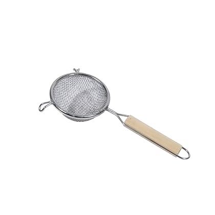 - Top quality fine mesh makes this strainer set as ideal for skimming light stock & fruit pulp as it is for draining super heavy loads of pasta and other weighty food materials.- Strong 15 lb stainless steel construction combined with an attractive stylish look makes these fine mesh strainers perfect for both professional kitchen performance and optimal kitchen appearance.- Convenient hanging holes on each of the fine mesh strainers make for quick and easy storage / access, on home and commercial kitchen storage racks.- Long handles on these worry-free stainless steel fine mesh strainers leave you assured that these strainers are as safe in a dishwasher as they are over a burning stove. - Enjoy hands-free straining using the broad, mirrored brims that comfortably sit on top of pots and other similar broth and fluid catching objects.the Stainless Steel Double Mesh Strainer With Wood Handle - 4" Dia. Versatile and engineered for superior drainage, this product offers everything you need from a space saver kitchen strainer: wash or rinse fruits, vegetables, berries, herbs, meats and more. Drain pasta, rice or canned foods. 6-quart capacity makes large cooking jobs go faster. Optimal performance characteristics tested and certified. Stainless Steel Double Mesh Strainer With Wood Handle - 4" Dia. is best for youStrainer, 4' dia. bowl, double mesh, wood handle, stainless steel construction. Strainer by the premiere manufacturer and supplier to the Chinese Foodservice industry.