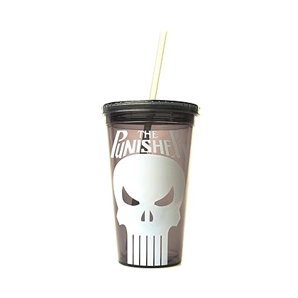 • The Silver Buffalo PE15087 Marvel The Punisher BPA-Free Plastic Cold Cup with Lid and Straw, 16 oz., Black is a