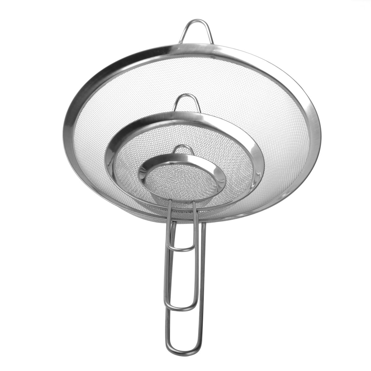 - DURABLE 3 PC. STAINLESS STEEL FINE MESH STRAINERS (3.35”, 5.5” & 7.88”) - Premium quality stainless steel strainers with non-heat warping, long wire handles, and beautiful, mirrored, broad rim design.