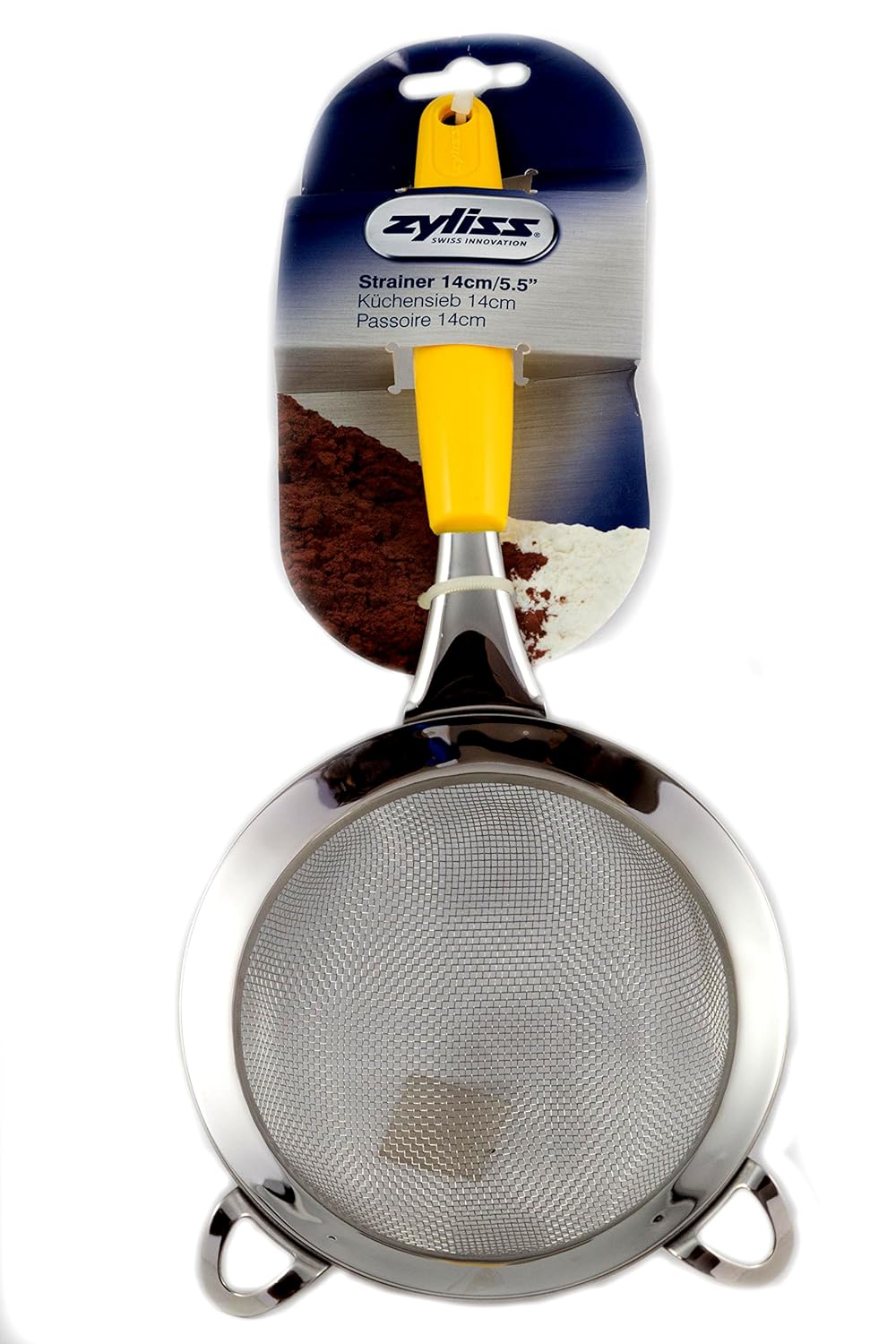 - Top quality fine mesh makes this strainer set as ideal for skimming light stock & fruit pulp as it is for draining super heavy loads of pasta and other weighty food materials.- Strong 15 lb stainless steel construction combined with an attractive stylish look makes these fine mesh strainers perfect for both professional kitchen performance and optimal kitchen appearance.- Convenient hanging holes on each of the fine mesh strainers make for quick and easy storage / access, on home and commercial kitchen storage racks.- Long handles on these worry-free stainless steel fine mesh strainers leave you assured that these strainers are as safe in a dishwasher as they are over a burning stove. - Enjoy hands-free straining using the broad, mirrored brims that comfortably sit on top of pots and other similar broth and fluid catching objects.the Zyliss 5.5-Inch Strainer, 2-Pack Versatile and engineered for superior drainage, this product offers everything you need from a space saver kitchen strainer: wash or rinse fruits, vegetables, berries, herbs, meats and more. Drain pasta, rice or canned foods. 6-quart capacity makes large cooking jobs go faster. Optimal performance characteristics tested and certified. Zyliss 5.5-Inch Strainer, 2-Pack is best for youYou?ve been working at the local bakery for what feels like forever. You finished culinary school, got your wedding cake, and celebrated many birthdays with one of your many sweet creations. While dusting a large spice cake with confectioner?s sugar, your 5.5 inch strainer loses its handle causing a powdery mess in the kitchen. After working with your smaller strainer, you decide that it is time to get an upgraded strainer. With a Zyliss Stainless Steel 5.5-Inch Strainer/Skimmer, you will be getting one of the finest crafted strainer/skimmers in the industry. Each Zyliss Stainless Steel 5.5-Inch Strainer/Skimmer has a fine mesh stainless steel cup, perfect for sifting, dusting, straining, skimming, and rinsing fruits and vegetables. Two hooks line the rim of the strainer/skimmer, making rinsing fruits and vegetables a breeze. By resting the hooks on the edge of the bowl, it will make it easier than a traditional strainer/skimmer to wash your items. Each strainer is equipped with a comfort grip handle, which makes your comfort one of Zyliss?s priorities. This strainer/skimmer is dishwasher safe, which makes cleaning this piece of kitchen equipment as easy as popping it in the dishwasher, pressing a few buttons, and then letting the appliance do its job.