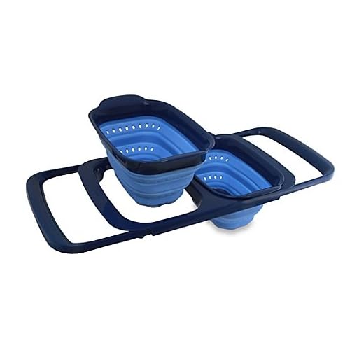 - Top quality fine mesh makes this strainer set as ideal for skimming light stock & fruit pulp as it is for draining super heavy loads of pasta and other weighty food materials.- Strong 15 lb stainless steel construction combined with an attractive stylish look makes these fine mesh strainers perfect for both professional kitchen performance and optimal kitchen appearance.- Convenient hanging holes on each of the fine mesh strainers make for quick and easy storage / access, on home and commercial kitchen storage racks.- Long handles on these worry-free stainless steel fine mesh strainers leave you assured that these strainers are as safe in a dishwasher as they are over a burning stove. - Enjoy hands-free straining using the broad, mirrored brims that comfortably sit on top of pots and other similar broth and fluid catching objects.the Squish Collapsible 2-Quart Double Over-The-Sink Colander, Perfect for Pasta, Vegetables and More, Dishwasher Safe, BPA Free - Blue Versatile and engineered for superior drainage, this product offers everything you need from a space saver kitchen strainer: wash or rinse fruits, vegetables, berries, herbs, meats and more. Drain pasta, rice or canned foods. 6-quart capacity makes large cooking jobs go faster. Optimal performance characteristics tested and certified. Squish Collapsible 2-Quart Double Over-The-Sink Colander, Perfect for Pasta, Vegetables and More, Dishwasher Safe, BPA Free - Blue is best for youThe perfect accessory to your kitchen, this convenient and easy to use colander features arms that extend over this sink to provide easy draining. Perfect for pasta, vegetables, and more, this innovative double colander is great for any chef.