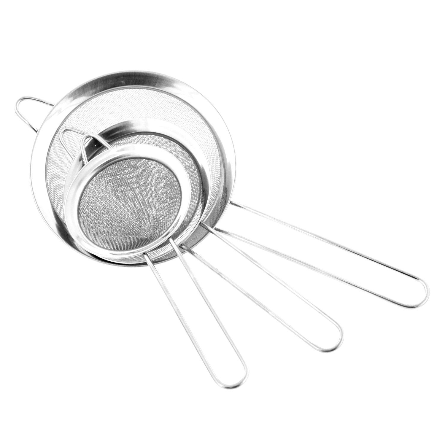 - DURABLE 3 PC. STAINLESS STEEL FINE MESH STRAINERS (3.35”, 5.5” & 7.88”) - Premium quality stainless steel strainers with non-heat warping, long wire handles, and beautiful, mirrored, broad rim design.