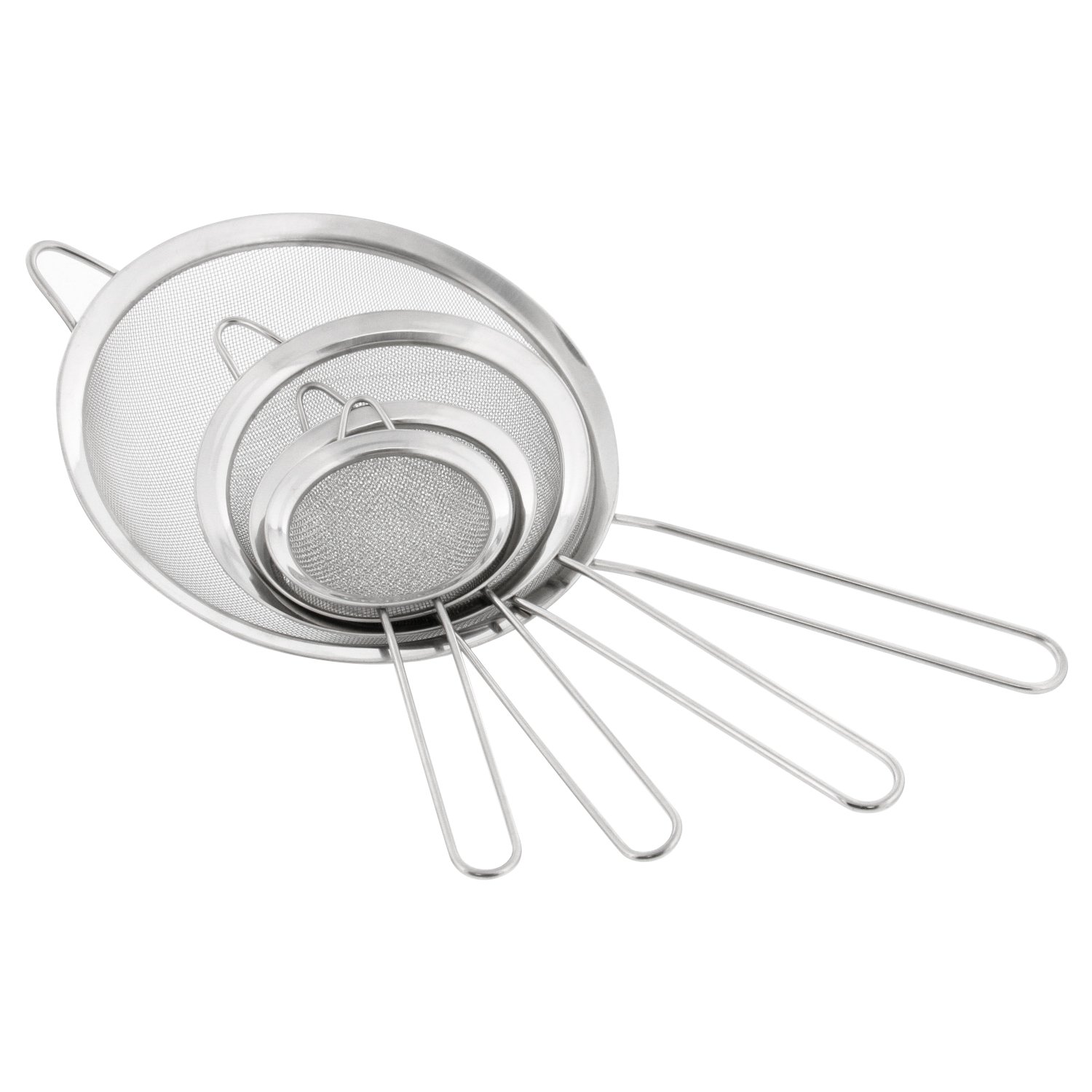 - DURABLE 3 PC. STAINLESS STEEL FINE MESH STRAINERS (3.35”, 5.5” & 7.88”) - Premium quality stainless steel strainers with non-heat warping, long wire handles, and beautiful, mirrored, broad rim design.