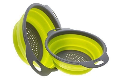 - Top quality fine mesh makes this strainer set as ideal for skimming light stock & fruit pulp as it is for draining super heavy loads of pasta and other weighty food materials.- Strong 15 lb stainless steel construction combined with an attractive stylish look makes these fine mesh strainers perfect for both professional kitchen performance and optimal kitchen appearance.- Convenient hanging holes on each of the fine mesh strainers make for quick and easy storage / access, on home and commercial kitchen storage racks.- Long handles on these worry-free stainless steel fine mesh strainers leave you assured that these strainers are as safe in a dishwasher as they are over a burning stove. - Enjoy hands-free straining using the broad, mirrored brims that comfortably sit on top of pots and other similar broth and fluid catching objects.the Collapsible Silicone Kitchen Strainer Kitchen Colander Grapes strawberries Cherries Fruit Bowl Strainer (Green) Versatile and engineered for superior drainage, this product offers everything you need from a space saver kitchen strainer: wash or rinse fruits, vegetables, berries, herbs, meats and more. Drain pasta, rice or canned foods. 6-quart capacity makes large cooking jobs go faster. Optimal performance characteristics tested and certified. Collapsible Silicone Kitchen Strainer Kitchen Colander Grapes strawberries Cherries Fruit Bowl Strainer (Green) is best for youMaterial: FDA Food grade material,PP+ rubber Small size:24.6 x 20cm(9.6” x 7.8”),Net weight:96g Large size:29.2 x 23.7cm(11.5” x 9.3”),Net weight:132g Collapsible Silicone Strainer Works for pasta, potatoes, broccoli, and all kinds of vegetables, including leafy greens and fruit include Grapes, strawberries ,Cherries etc. Space saving design, Pack of 2 Collapsible Silicone Kitchen Strainer basket, Strainers are foldable Ergonomic and comfortable handles Adaptation temperature: low temperature -40, high temperature +230 Applicable: microwave ovens, ovens, dishwasher chassis, steamer. Can be boiled disinfection. Note:Due to the manual measurement and different measurement methods, please allow 2-3cm deviation. Include:1 X Fruit Vegetable Bowls