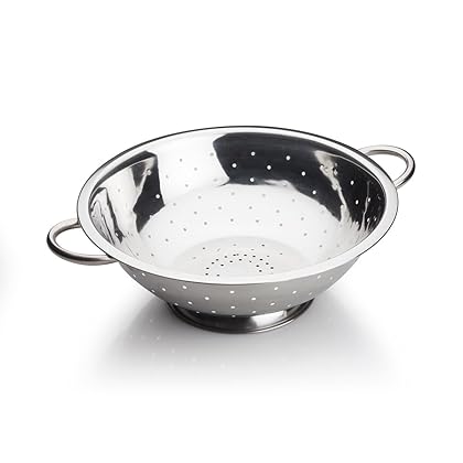 - Top quality fine mesh makes this strainer set as ideal for skimming light stock & fruit pulp as it is for draining super heavy loads of pasta and other weighty food materials.- Strong 15 lb stainless steel construction combined with an attractive stylish look makes these fine mesh strainers perfect for both professional kitchen performance and optimal kitchen appearance.- Convenient hanging holes on each of the fine mesh strainers make for quick and easy storage / access, on home and commercial kitchen storage racks.- Long handles on these worry-free stainless steel fine mesh strainers leave you assured that these strainers are as safe in a dishwasher as they are over a burning stove. - Enjoy hands-free straining using the broad, mirrored brims that comfortably sit on top of pots and other similar broth and fluid catching objects.the FortheChef's 5 Qt. Stainless Steel Colander, 12" Diameter Versatile and engineered for superior drainage, this product offers everything you need from a space saver kitchen strainer: wash or rinse fruits, vegetables, berries, herbs, meats and more. Drain pasta, rice or canned foods. 6-quart capacity makes large cooking jobs go faster. Optimal performance characteristics tested and certified. FortheChef's 5 Qt. Stainless Steel Colander, 12" Diameter is best for youThis colander is a versatile kitchenware tool ideal for draining foods like pasta and rice and rinsing fruits and vegetables. Similar to, but sturdier than a strainer, it features perforations that allow liquid to flow through while solid food is retained inside the colander. A protective base at the bottom allows the colander to be more stable when it is placed on the countertop or in the kitchen sink, and the rounded handles on each side facilitate transport. Crafted from professional-quality stainless steel, this colander is highly durable. Offered in three sizes, take your pick depending on intended use. Ideally, it's convenient to have all three sizes in your kitchen.