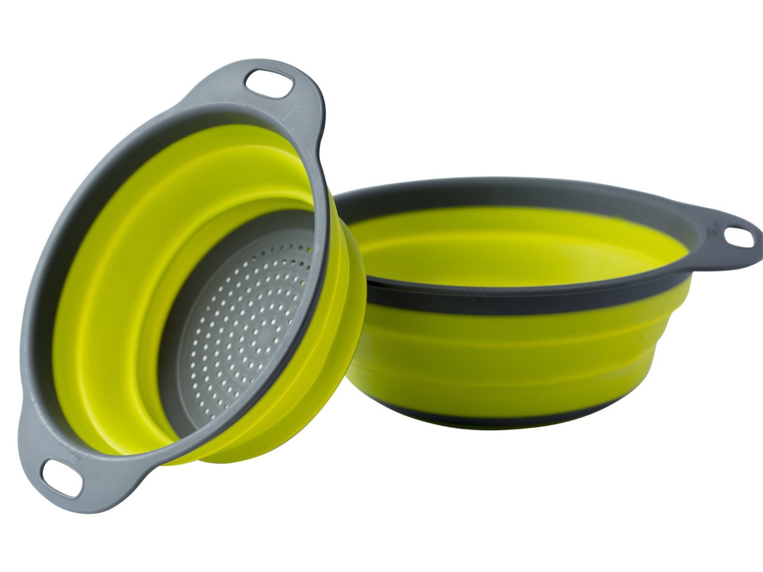 - Top quality fine mesh makes this strainer set as ideal for skimming light stock & fruit pulp as it is for draining super heavy loads of pasta and other weighty food materials.- Strong 15 lb stainless steel construction combined with an attractive stylish look makes these fine mesh strainers perfect for both professional kitchen performance and optimal kitchen appearance.- Convenient hanging holes on each of the fine mesh strainers make for quick and easy storage / access, on home and commercial kitchen storage racks.- Long handles on these worry-free stainless steel fine mesh strainers leave you assured that these strainers are as safe in a dishwasher as they are over a burning stove. - Enjoy hands-free straining using the broad, mirrored brims that comfortably sit on top of pots and other similar broth and fluid catching objects.the Erasky Colander Set - 2 Collapsible Colanders (Strainers) Set - Includes 2 Folding Strainers Sizes 9.7" - 11.5" 2 Quart (green) Versatile and engineered for superior drainage, this product offers everything you need from a space saver kitchen strainer: wash or rinse fruits, vegetables, berries, herbs, meats and more. Drain pasta, rice or canned foods. 6-quart capacity makes large cooking jobs go faster. Optimal performance characteristics tested and certified. Erasky Colander Set - 2 Collapsible Colanders (Strainers) Set - Includes 2 Folding Strainers Sizes 9.7" - 11.5" 2 Quart (green) is best for youSET OF 2 COLLAPSIBLE COLANDERS FOR YOUR KITCHEN The package includes two strainers / colanders:Large :29.2*23.7cm, weight:132g ; Small:24.6*20cm, weight:96g .Two sizes means not having to wash your only strainer before you prepare a second part of your meal. It can fit different pot sizes. Use this folding colander with pasta, fruit, berries, vegetables or any other produce. This two-piece colander set is also a great value - TWO IS BETTER THAN ONE! The handles are comfortable, soft and will not slip. These food strainers are heat resistant up to 176ºF, so even hot boiling water will not cause any damage. Heat also will not transfer as it would with metal, so your hands will be safer. COMPACT, ERGONOMIC DESIGN 2-Piece Strainer Set will nicely compliment any kitchen. Whether your kitchen is big or small, this colander set will safe you some much needed space, while performing the tasks you need. When folded, these colanders are only 1.25' tall, making it very easy to store them in a kitchen drawer or a cupboard. GREAT STRAINERS AND COLANDERS FOR CAMPING, RV, COTTAGE OR BEACH HOUSE The compact size of this colander set makes it your perfect companion for a camping trip or keeping these handy in your RV or Camper. And how about having a set in your cabin or a beach house? The heat resistant, durable, lasting, FDA Food Grade Silicone strainers fold easily to save you much needed space in the kitchen.