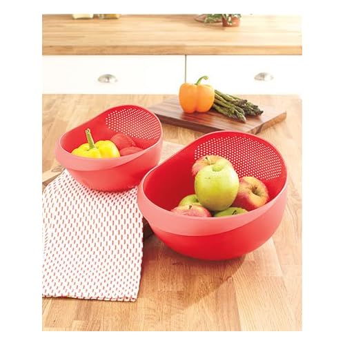 - Top quality fine mesh makes this strainer set as ideal for skimming light stock & fruit pulp as it is for draining super heavy loads of pasta and other weighty food materials.- Strong 15 lb stainless steel construction combined with an attractive stylish look makes these fine mesh strainers perfect for both professional kitchen performance and optimal kitchen appearance.- Convenient hanging holes on each of the fine mesh strainers make for quick and easy storage / access, on home and commercial kitchen storage racks.- Long handles on these worry-free stainless steel fine mesh strainers leave you assured that these strainers are as safe in a dishwasher as they are over a burning stove. - Enjoy hands-free straining using the broad, mirrored brims that comfortably sit on top of pots and other similar broth and fluid catching objects.the Bowls, Multi-use- Colander Versatile and engineered for superior drainage, this product offers everything you need from a space saver kitchen strainer: wash or rinse fruits, vegetables, berries, herbs, meats and more. Drain pasta, rice or canned foods. 6-quart capacity makes large cooking jobs go faster. Optimal performance characteristics tested and certified. Bowls, Multi-use- Colander is best for youTake the strain out of cooking and eliminate messes with the Set of 2 Multi-Use Bowls. You don't need to clutter your area with more than 1 container. These handy bowls can be used to rinse, drain and mix. They can be used as servers, too. A rubber ring on the underside minimizes slippage. Polypropylene. Dishwasher safe. Shortens preparation time Rinse, drain and mix, then serve all in 1 container Set includes: Small, 8-3/4'W x 7'D x 5'H Large, 12'W x 9-1/4'D x 7'H Details: Polypropylene Dishwasher safe