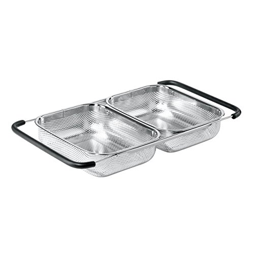 - Top quality fine mesh makes this strainer set as ideal for skimming light stock & fruit pulp as it is for draining super heavy loads of pasta and other weighty food materials.- Strong 15 lb stainless steel construction combined with an attractive stylish look makes these fine mesh strainers perfect for both professional kitchen performance and optimal kitchen appearance.- Convenient hanging holes on each of the fine mesh strainers make for quick and easy storage / access, on home and commercial kitchen storage racks.- Long handles on these worry-free stainless steel fine mesh strainers leave you assured that these strainers are as safe in a dishwasher as they are over a burning stove. - Enjoy hands-free straining using the broad, mirrored brims that comfortably sit on top of pots and other similar broth and fluid catching objects.the Oggi Corporation 5626 23" Stainless Steel Over-The-Sink Double Basket Strainer Versatile and engineered for superior drainage, this product offers everything you need from a space saver kitchen strainer: wash or rinse fruits, vegetables, berries, herbs, meats and more. Drain pasta, rice or canned foods. 6-quart capacity makes large cooking jobs go faster. Optimal performance characteristics tested and certified. Oggi Corporation 5626 23" Stainless Steel Over-The-Sink Double Basket Strainer is best for you* Fine holes design allows for fast and efficient drainage without food escaping* Soft grip handles make for easy handling* Dishwasher safe* NSF approved* Stainless steel* Expands to 23'