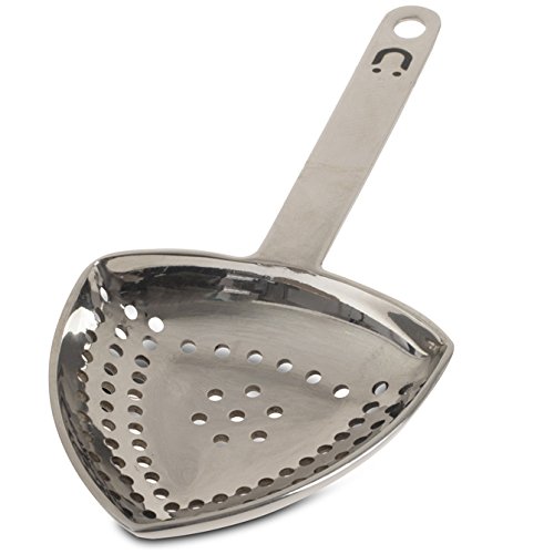 - Top quality fine mesh makes this strainer set as ideal for skimming light stock & fruit pulp as it is for draining super heavy loads of pasta and other weighty food materials.- Strong 15 lb stainless steel construction combined with an attractive stylish look makes these fine mesh strainers perfect for both professional kitchen performance and optimal kitchen appearance.- Convenient hanging holes on each of the fine mesh strainers make for quick and easy storage / access, on home and commercial kitchen storage racks.- Long handles on these worry-free stainless steel fine mesh strainers leave you assured that these strainers are as safe in a dishwasher as they are over a burning stove. - Enjoy hands-free straining using the broad, mirrored brims that comfortably sit on top of pots and other similar broth and fluid catching objects.the Uber Juliep Cocktail Strainer Versatile and engineered for superior drainage, this product offers everything you need from a space saver kitchen strainer: wash or rinse fruits, vegetables, berries, herbs, meats and more. Drain pasta, rice or canned foods. 6-quart capacity makes large cooking jobs go faster. Optimal performance characteristics tested and certified. Uber Juliep Cocktail Strainer is best for youJuliep Cocktail StrainerThe all stainless steel Juliep™ is the sturdy ice scoop and strainer all in one! 3 width x 6.5 length.
