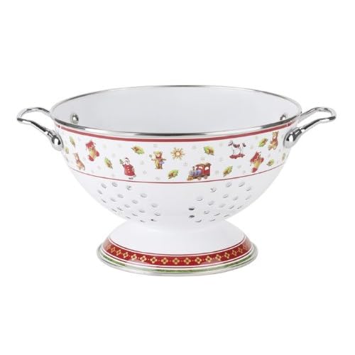 - Top quality fine mesh makes this strainer set as ideal for skimming light stock & fruit pulp as it is for draining super heavy loads of pasta and other weighty food materials.- Strong 15 lb stainless steel construction combined with an attractive stylish look makes these fine mesh strainers perfect for both professional kitchen performance and optimal kitchen appearance.- Convenient hanging holes on each of the fine mesh strainers make for quick and easy storage / access, on home and commercial kitchen storage racks.- Long handles on these worry-free stainless steel fine mesh strainers leave you assured that these strainers are as safe in a dishwasher as they are over a burning stove. - Enjoy hands-free straining using the broad, mirrored brims that comfortably sit on top of pots and other similar broth and fluid catching objects.the VILLEROY & BOCH Toy's Delight Colander Versatile and engineered for superior drainage, this product offers everything you need from a space saver kitchen strainer: wash or rinse fruits, vegetables, berries, herbs, meats and more. Drain pasta, rice or canned foods. 6-quart capacity makes large cooking jobs go faster. Optimal performance characteristics tested and certified. VILLEROY & BOCH Toy's Delight Colander is best for youColander - Red And Green Seasonal Pattern - Dishwasher & Microwave Safe