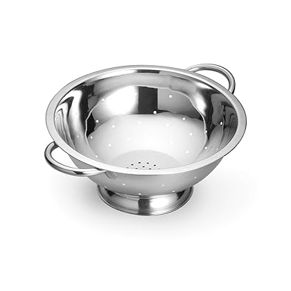 - Top quality fine mesh makes this strainer set as ideal for skimming light stock & fruit pulp as it is for draining super heavy loads of pasta and other weighty food materials.- Strong 15 lb stainless steel construction combined with an attractive stylish look makes these fine mesh strainers perfect for both professional kitchen performance and optimal kitchen appearance.- Convenient hanging holes on each of the fine mesh strainers make for quick and easy storage / access, on home and commercial kitchen storage racks.- Long handles on these worry-free stainless steel fine mesh strainers leave you assured that these strainers are as safe in a dishwasher as they are over a burning stove. - Enjoy hands-free straining using the broad, mirrored brims that comfortably sit on top of pots and other similar broth and fluid catching objects.the TableCraft H803 3 quart Heavy Duty Footed Colander with Handles, 10-Inch, Silver Versatile and engineered for superior drainage, this product offers everything you need from a space saver kitchen strainer: wash or rinse fruits, vegetables, berries, herbs, meats and more. Drain pasta, rice or canned foods. 6-quart capacity makes large cooking jobs go faster. Optimal performance characteristics tested and certified. TableCraft H803 3 quart Heavy Duty Footed Colander with Handles, 10-Inch, Silver is best for youThese Table Craft stainless steel heavy duty footed colanders with handles are easy to care for and dishwasher safe. 3 quart size.