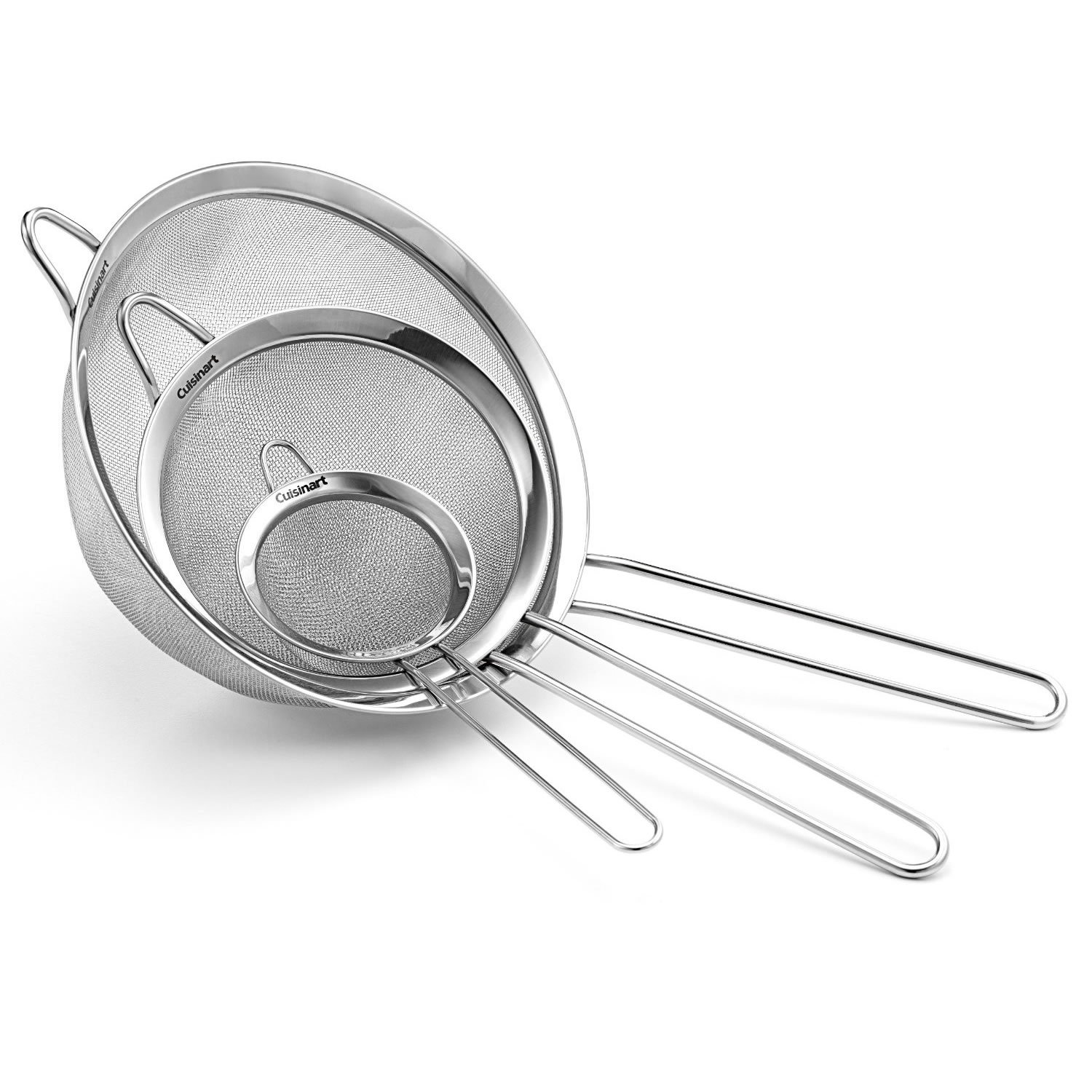 - DURABLE 3 PC. STAINLESS STEEL FINE MESH STRAINERS (3.35”, 5.5” & 7.88”) - Premium quality stainless steel strainers with non-heat warping, long wire handles, and beautiful, mirrored, broad rim design.