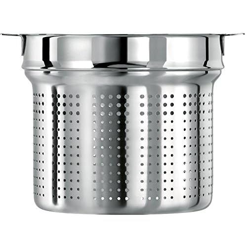 - Top quality fine mesh makes this strainer set as ideal for skimming light stock & fruit pulp as it is for draining super heavy loads of pasta and other weighty food materials.- Strong 15 lb stainless steel construction combined with an attractive stylish look makes these fine mesh strainers perfect for both professional kitchen performance and optimal kitchen appearance.- Convenient hanging holes on each of the fine mesh strainers make for quick and easy storage / access, on home and commercial kitchen storage racks.- Long handles on these worry-free stainless steel fine mesh strainers leave you assured that these strainers are as safe in a dishwasher as they are over a burning stove. - Enjoy hands-free straining using the broad, mirrored brims that comfortably sit on top of pots and other similar broth and fluid catching objects.the Cristel Casteline Removable Handle 8" Pasta Basket Versatile and engineered for superior drainage, this product offers everything you need from a space saver kitchen strainer: wash or rinse fruits, vegetables, berries, herbs, meats and more. Drain pasta, rice or canned foods. 6-quart capacity makes large cooking jobs go faster. Optimal performance characteristics tested and certified. Cristel Casteline Removable Handle 8" Pasta Basket is best for youBoil and strain pasta easily for a family spaghetti dinner with this pasta insert from the Multiply collection by Cristel. Made out of aluminum sandwiched between two layers of 18/10 stainless steel plus a triple sole, it is durable and long lasting. It features a removable long handle with a silicone button and two removable side handles to help transport from stove to tabletop, while also maintaining temperature during service. The domed glass lid is greatly appreciated for its transparency, which allows the cooking process to be easily monitored. Temperature is distributed evenly across the entire product for gentle, economical and tasty cooking. Furthermore, the wide and efficient pouring edge is sealed so that the aluminum core cannot enter into contact with food. Best of all, it includes a limited lifetime warranty and is dishwasher safe to make clean up a breeze. Removable handles are sold separately.8' diameter, with a 5 quart capacity