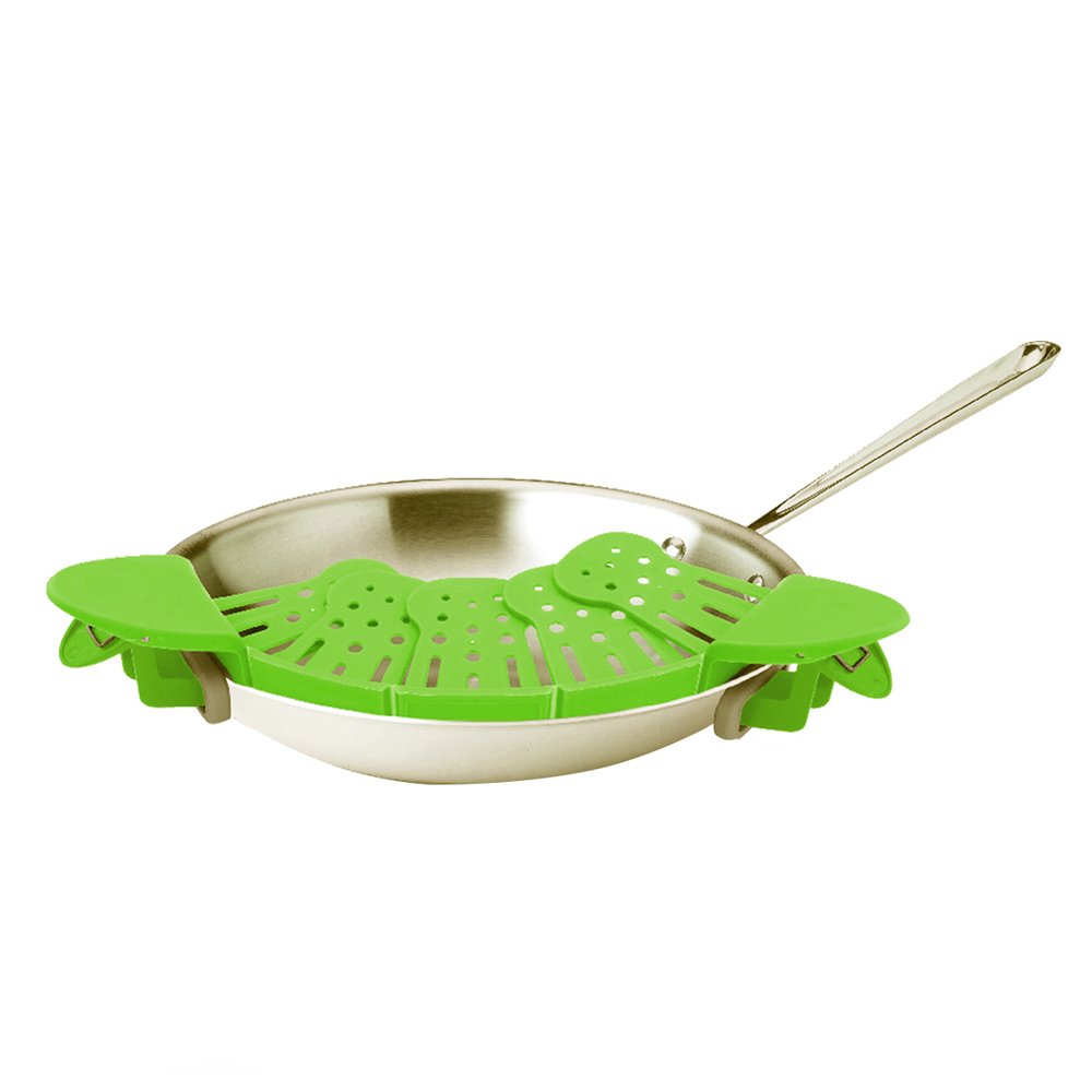 - STABLE STRAINING - The innovative & unique design helps free up your hands so you can use them to hold on to the handle/s of the pan for better control. No need to hold a strainer or a lid against the pot while trying to drain boiling hot excess liquid. No more burnt fingers from steam
