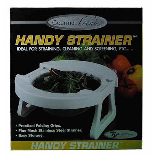 - Top quality fine mesh makes this strainer set as ideal for skimming light stock & fruit pulp as it is for draining super heavy loads of pasta and other weighty food materials.- Strong 15 lb stainless steel construction combined with an attractive stylish look makes these fine mesh strainers perfect for both professional kitchen performance and optimal kitchen appearance.- Convenient hanging holes on each of the fine mesh strainers make for quick and easy storage / access, on home and commercial kitchen storage racks.- Long handles on these worry-free stainless steel fine mesh strainers leave you assured that these strainers are as safe in a dishwasher as they are over a burning stove. - Enjoy hands-free straining using the broad, mirrored brims that comfortably sit on top of pots and other similar broth and fluid catching objects.the Handy Strainer, Ideal for Straining, Cleaning and Screening Versatile and engineered for superior drainage, this product offers everything you need from a space saver kitchen strainer: wash or rinse fruits, vegetables, berries, herbs, meats and more. Drain pasta, rice or canned foods. 6-quart capacity makes large cooking jobs go faster. Optimal performance characteristics tested and certified. Handy Strainer, Ideal for Straining, Cleaning and Screening is best for youMeasures approx 8 3/4' x 9 1/4' Ideal for straining & cleaning & screening Features practical folding grips Adjustable hinged handles for many uses