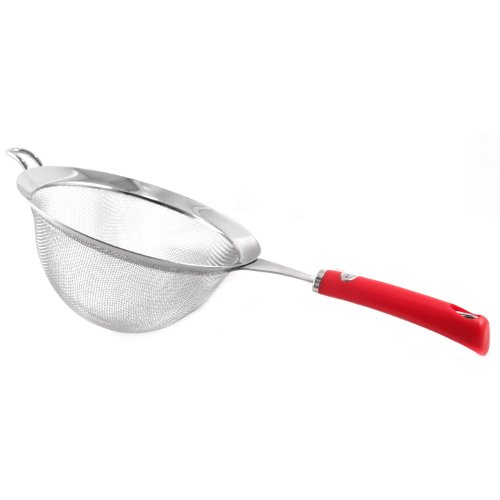 - Top quality fine mesh makes this strainer set as ideal for skimming light stock & fruit pulp as it is for draining super heavy loads of pasta and other weighty food materials.- Strong 15 lb stainless steel construction combined with an attractive stylish look makes these fine mesh strainers perfect for both professional kitchen performance and optimal kitchen appearance.- Convenient hanging holes on each of the fine mesh strainers make for quick and easy storage / access, on home and commercial kitchen storage racks.- Long handles on these worry-free stainless steel fine mesh strainers leave you assured that these strainers are as safe in a dishwasher as they are over a burning stove. - Enjoy hands-free straining using the broad, mirrored brims that comfortably sit on top of pots and other similar broth and fluid catching objects.the Ghidini Stainless Steel Strainer and Sifter Versatile and engineered for superior drainage, this product offers everything you need from a space saver kitchen strainer: wash or rinse fruits, vegetables, berries, herbs, meats and more. Drain pasta, rice or canned foods. 6-quart capacity makes large cooking jobs go faster. Optimal performance characteristics tested and certified. Ghidini Stainless Steel Strainer and Sifter is best for youPerform a variety of different tasks with medium sized strainer from Ghidini. The straining basket is made from high quality stainless steel with fine mesh so you can rinse small foods like berries and lentils, and even sift flour. It also features a smooth and sturdy red handle for an ergonomic grip, as well as a hook so it can be rested on top of bowls or pans and make for easy storage.7' diameter x 4' H