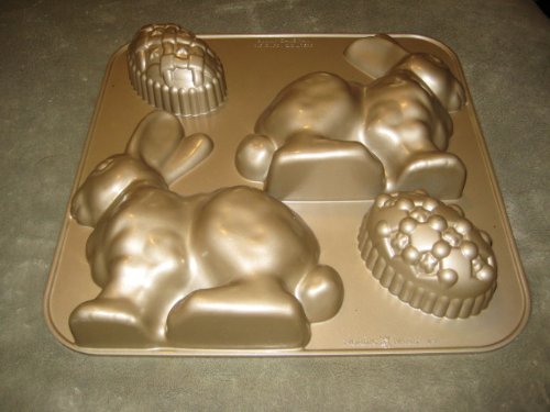 avid bakers find themselves in this predicament frequently and can attest to the fact that having a safe transportation container is key! the Bundt cake keeper is the perfect solution to this age-old problem. Place your freshly-baked Bundt cake inside, set the cover on top and twist to lock the cake safely inside. You're now ready for transportation to and from a party. Best of all, the cake keeper will keep your cakes fresh and looks great sitting on your countertop. The cake keeper is very durable and can be put through your dishwasher for simple cleanup. Base comes in assorted colors. BPA- and melamine-free plastic.the Nordic Ware Heavy 3D Bunny Rabbit & Egg 9 1/2 Cups Cake Baking Pan USA Spoon the batter into the pan slowly to prevent the formation of air bubbles. Tap the pan 3 times gently on a work surface to release any bubbles that may have developed and ensure the batter reaches all crevices in the design. Using a rubber or silicone spatula, spread the batter so the sides are slightly higher than the center. The cake will bake more evenly and be less likely to form peaks.Our beloved Bundts are produced with lots of hand touch and care, ensuring that they will last for a lifetime. We've perfected this process over the past seven decades--there is a lot of science behind created the best Bundts on earth! At the die casting facility, molten aluminum at temperatures of over 1200 degrees F is ladled into a chamber where an arm rapidly pushes the liquid aluminum into the die (mold). This takes place in a fraction of a second, and the aluminum solidifies as it hits the cooler mold. The two halves of the mold open up, releasing a very hot but solid aluminum Bundt pan.Nordic Ware Heavy 3D Bunny Rabbit & Egg 9 1/2 Cups Cake Baking Pan USA is best for youHeavy duty Nordic Ware Easter Bunny and Egg cake pan.