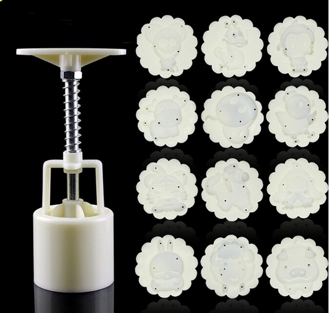avid bakers find themselves in this predicament frequently and can attest to the fact that having a safe transportation container is key! the Bundt cake keeper is the perfect solution to this age-old problem. Place your freshly-baked Bundt cake inside, set the cover on top and twist to lock the cake safely inside. You're now ready for transportation to and from a party. Best of all, the cake keeper will keep your cakes fresh and looks great sitting on your countertop. The cake keeper is very durable and can be put through your dishwasher for simple cleanup. Base comes in assorted colors. BPA- and melamine-free plastic.the Round Shape Zodiac modeling Moon Cake Pastry Mold Hand Pressure 50g One Barrel12 Chinese zodiac piece baking mold for Mid-Autumn Spoon the batter into the pan slowly to prevent the formation of air bubbles. Tap the pan 3 times gently on a work surface to release any bubbles that may have developed and ensure the batter reaches all crevices in the design. Using a rubber or silicone spatula, spread the batter so the sides are slightly higher than the center. The cake will bake more evenly and be less likely to form peaks.Our beloved Bundts are produced with lots of hand touch and care, ensuring that they will last for a lifetime. We've perfected this process over the past seven decades--there is a lot of science behind created the best Bundts on earth! At the die casting facility, molten aluminum at temperatures of over 1200 degrees F is ladled into a chamber where an arm rapidly pushes the liquid aluminum into the die (mold). This takes place in a fraction of a second, and the aluminum solidifies as it hits the cooler mold. The two halves of the mold open up, releasing a very hot but solid aluminum Bundt pan.Round Shape Zodiac modeling Moon Cake Pastry Mold Hand Pressure 50g One Barrel12 Chinese zodiac piece baking mold for Mid-Autumn is best for youDescription: The new moon cake mold design hand against pressure food-grade plastic set super good quality Features: 100% Brand New and High Quality Traditional Chinese Zodiac modeling This moon cake mold makes a 50g mooncake. One set include 13 stamps. Weight of Cake: <= 50g. Made of food-grade plastic, non-toxic, odorless, ease of use Made of high-quality material, they are durable for long-term use Environmentally friendly and reusable Specifications: Type: Cake Tool Mold Color: White Material: Plastic Package Content: 13 pc/Lot (1 Moon Cake Tool + 12 Stamps)
