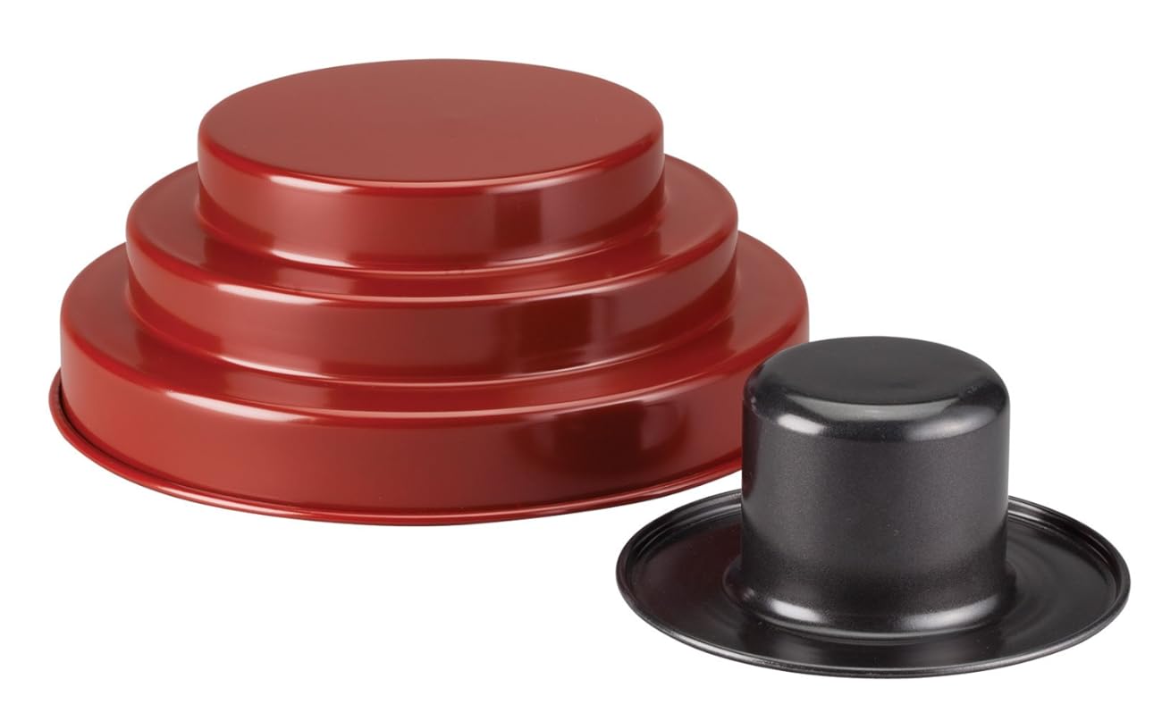 avid bakers find themselves in this predicament frequently and can attest to the fact that having a safe transportation container is key! the Bundt cake keeper is the perfect solution to this age-old problem. Place your freshly-baked Bundt cake inside, set the cover on top and twist to lock the cake safely inside. You're now ready for transportation to and from a party. Best of all, the cake keeper will keep your cakes fresh and looks great sitting on your countertop. The cake keeper is very durable and can be put through your dishwasher for simple cleanup. Base comes in assorted colors. BPA- and melamine-free plastic.the Miles Kimball Tiered Cake Pan Spoon the batter into the pan slowly to prevent the formation of air bubbles. Tap the pan 3 times gently on a work surface to release any bubbles that may have developed and ensure the batter reaches all crevices in the design. Using a rubber or silicone spatula, spread the batter so the sides are slightly higher than the center. The cake will bake more evenly and be less likely to form peaks.Our beloved Bundts are produced with lots of hand touch and care, ensuring that they will last for a lifetime. We've perfected this process over the past seven decades--there is a lot of science behind created the best Bundts on earth! At the die casting facility, molten aluminum at temperatures of over 1200 degrees F is ladled into a chamber where an arm rapidly pushes the liquid aluminum into the die (mold). This takes place in a fraction of a second, and the aluminum solidifies as it hits the cooler mold. The two halves of the mold open up, releasing a very hot but solid aluminum Bundt pan.Miles Kimball Tiered Cake Pan is best for youColor:Red Bake and fill a 3-tiered cake in a single pan with this tiered cake pan ... no culinary skills needed! Simply add any mix or recipe to this non-stick 3-tier cake pan; optional insert creates a well for filling with fruit, whipped cream or pudding for additional oohs and aahs. Non-stick metal; dishwasher safe. 4' high x 10 1/2' diameter.