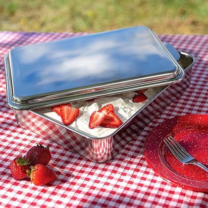 avid bakers find themselves in this predicament frequently and can attest to the fact that having a safe transportation container is key! the Bundt cake keeper is the perfect solution to this age-old problem. Place your freshly-baked Bundt cake inside, set the cover on top and twist to lock the cake safely inside. You're now ready for transportation to and from a party. Best of all, the cake keeper will keep your cakes fresh and looks great sitting on your countertop. The cake keeper is very durable and can be put through your dishwasher for simple cleanup. Base comes in assorted colors. BPA- and melamine-free plastic.the Stainless Steel Cake Pan Spoon the batter into the pan slowly to prevent the formation of air bubbles. Tap the pan 3 times gently on a work surface to release any bubbles that may have developed and ensure the batter reaches all crevices in the design. Using a rubber or silicone spatula, spread the batter so the sides are slightly higher than the center. The cake will bake more evenly and be less likely to form peaks.Our beloved Bundts are produced with lots of hand touch and care, ensuring that they will last for a lifetime. We've perfected this process over the past seven decades--there is a lot of science behind created the best Bundts on earth! At the die casting facility, molten aluminum at temperatures of over 1200 degrees F is ladled into a chamber where an arm rapidly pushes the liquid aluminum into the die (mold). This takes place in a fraction of a second, and the aluminum solidifies as it hits the cooler mold. The two halves of the mold open up, releasing a very hot but solid aluminum Bundt pan.Stainless Steel Cake Pan is best for youPerfect for potlucks or carry-ins! The raised stainless steel lid snaps over the pan, protecting the food inside. Culinary creations arrive at their destination in perfect shape. No more mussed frosting on cakes or cracked casseroles. Ideal for cakes, desserts, casseroles, or transporting food to holiday parties Bake, decorate and take all in one pan Professional quality, heavy-duty stainless steel will last a lifetime without rusting Inside 13'L x 9-1/8'W With lid 14-1/8'L x 10'W x 3'H, 2-1/2 lb China