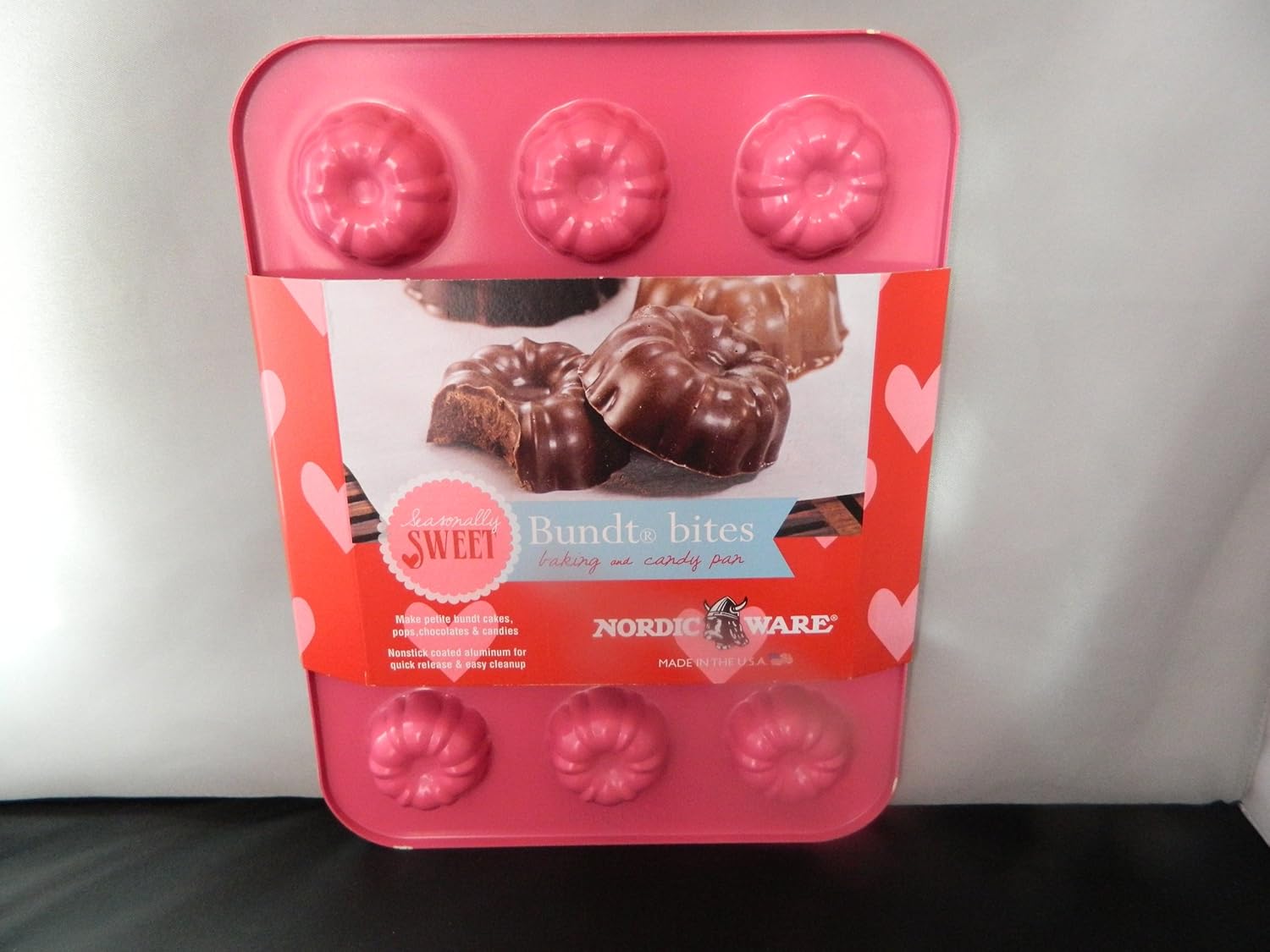 avid bakers find themselves in this predicament frequently and can attest to the fact that having a safe transportation container is key! the Bundt cake keeper is the perfect solution to this age-old problem. Place your freshly-baked Bundt cake inside, set the cover on top and twist to lock the cake safely inside. You're now ready for transportation to and from a party. Best of all, the cake keeper will keep your cakes fresh and looks great sitting on your countertop. The cake keeper is very durable and can be put through your dishwasher for simple cleanup. Base comes in assorted colors. BPA- and melamine-free plastic.the Nordic Ware Mini bundt Bites baking & candy Pan - 12 cavities Spoon the batter into the pan slowly to prevent the formation of air bubbles. Tap the pan 3 times gently on a work surface to release any bubbles that may have developed and ensure the batter reaches all crevices in the design. Using a rubber or silicone spatula, spread the batter so the sides are slightly higher than the center. The cake will bake more evenly and be less likely to form peaks.Our beloved Bundts are produced with lots of hand touch and care, ensuring that they will last for a lifetime. We've perfected this process over the past seven decades--there is a lot of science behind created the best Bundts on earth! At the die casting facility, molten aluminum at temperatures of over 1200 degrees F is ladled into a chamber where an arm rapidly pushes the liquid aluminum into the die (mold). This takes place in a fraction of a second, and the aluminum solidifies as it hits the cooler mold. The two halves of the mold open up, releasing a very hot but solid aluminum Bundt pan.Nordic Ware Mini bundt Bites baking & candy Pan - 12 cavities is best for you12 cavity mini bundt bites baking / candy pan