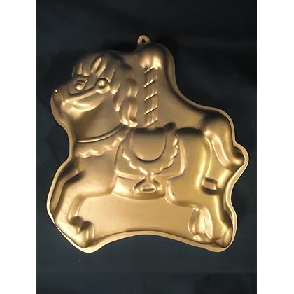 avid bakers find themselves in this predicament frequently and can attest to the fact that having a safe transportation container is key! the Bundt cake keeper is the perfect solution to this age-old problem. Place your freshly-baked Bundt cake inside, set the cover on top and twist to lock the cake safely inside. You're now ready for transportation to and from a party. Best of all, the cake keeper will keep your cakes fresh and looks great sitting on your countertop. The cake keeper is very durable and can be put through your dishwasher for simple cleanup. Base comes in assorted colors. BPA- and melamine-free plastic.the Wilton Horse Carousel Cake Pan -- 1990 -- Great for Happy Birthday Cake Spoon the batter into the pan slowly to prevent the formation of air bubbles. Tap the pan 3 times gently on a work surface to release any bubbles that may have developed and ensure the batter reaches all crevices in the design. Using a rubber or silicone spatula, spread the batter so the sides are slightly higher than the center. The cake will bake more evenly and be less likely to form peaks.Our beloved Bundts are produced with lots of hand touch and care, ensuring that they will last for a lifetime. We've perfected this process over the past seven decades--there is a lot of science behind created the best Bundts on earth! At the die casting facility, molten aluminum at temperatures of over 1200 degrees F is ladled into a chamber where an arm rapidly pushes the liquid aluminum into the die (mold). This takes place in a fraction of a second, and the aluminum solidifies as it hits the cooler mold. The two halves of the mold open up, releasing a very hot but solid aluminum Bundt pan.Wilton Horse Carousel Cake Pan -- 1990 -- Great for Happy Birthday Cake is best for youWilton Horse Carousel Cake Pan -- 1990