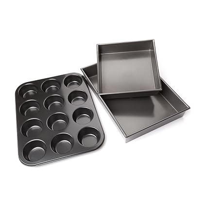 • The FortheChef's 3 Piece Deluxe Professional Non-Stick Cake and Muffin Pan Set is a