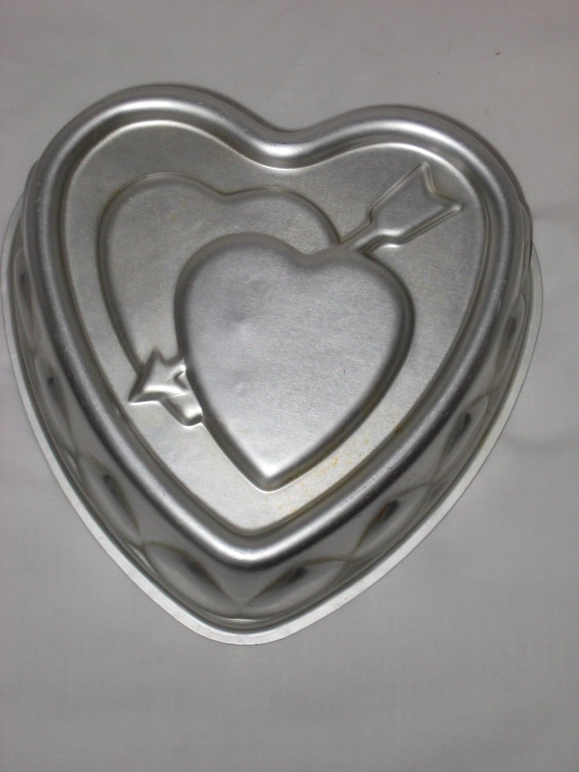 avid bakers find themselves in this predicament frequently and can attest to the fact that having a safe transportation container is key! the Bundt cake keeper is the perfect solution to this age-old problem. Place your freshly-baked Bundt cake inside, set the cover on top and twist to lock the cake safely inside. You're now ready for transportation to and from a party. Best of all, the cake keeper will keep your cakes fresh and looks great sitting on your countertop. The cake keeper is very durable and can be put through your dishwasher for simple cleanup. Base comes in assorted colors. BPA- and melamine-free plastic.the Vintage Wear-Ever Double Heart & Arrow 4 1/2 Cup 8 1/2 x 8" Cake Pan Spoon the batter into the pan slowly to prevent the formation of air bubbles. Tap the pan 3 times gently on a work surface to release any bubbles that may have developed and ensure the batter reaches all crevices in the design. Using a rubber or silicone spatula, spread the batter so the sides are slightly higher than the center. The cake will bake more evenly and be less likely to form peaks.Our beloved Bundts are produced with lots of hand touch and care, ensuring that they will last for a lifetime. We've perfected this process over the past seven decades--there is a lot of science behind created the best Bundts on earth! At the die casting facility, molten aluminum at temperatures of over 1200 degrees F is ladled into a chamber where an arm rapidly pushes the liquid aluminum into the die (mold). This takes place in a fraction of a second, and the aluminum solidifies as it hits the cooler mold. The two halves of the mold open up, releasing a very hot but solid aluminum Bundt pan.Vintage Wear-Ever Double Heart & Arrow 4 1/2 Cup 8 1/2 x 8" Cake Pan is best for youVintage Wear-Ever Double Heart & Arrow 4 1/2 Cup 8 1/2 x 8' Cake Baking Pan