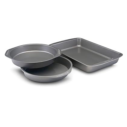 • The Farberware Nonstick Bakeware 3-Piece Cake Pan Set, Gray is a