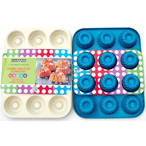 • The casaWare Ceramic Coated Non-Stick 12 Cup Mini Fluted Cake Pan (Cream/Blue) is a