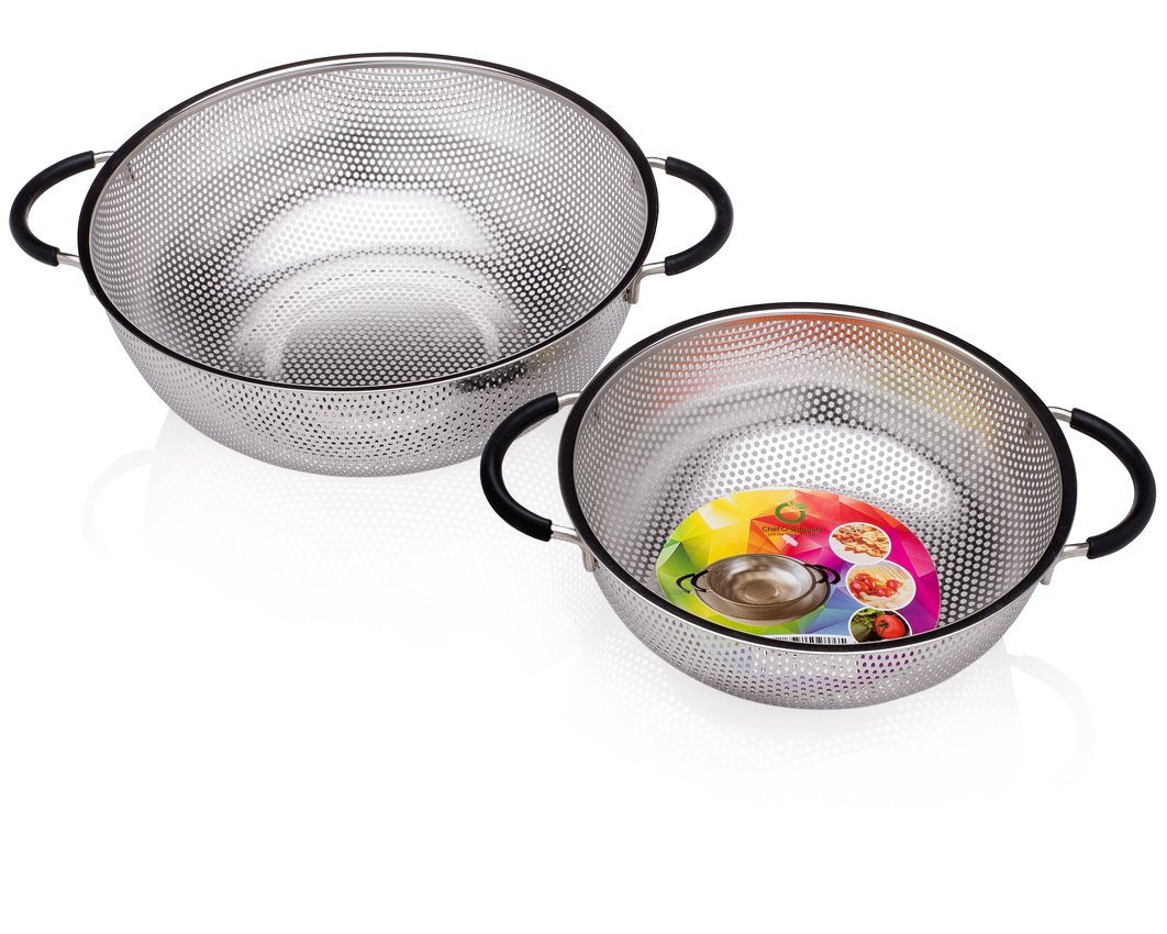 Chef O' Gadgets Colander Set of 2: Stainless Steel Micro Perforated 5-quart & 3-quart Strainers with Heat-Resistant Silicone Handles - Perfect for Pasta, Basmati Rice, Orzo, Fruits & Vegetables is best for youStraining and draining are important steps when you're cooking with pasta, rice, basmati, orzo, fruits, vegetables and other foods, but it shouldn’t have to be a difficult part of preparing recipes. Ordinary colanders can cause problems like splashing, backwashing and letting small pieces of food fall through, but you can eliminate these hassles for good by switching to the strainers in the Chef O' Gadgets 2 Micro-Perforated Stainless Steel Colander Set! The Chef O' Gadgets 2 Micro-Perforated Stainless Steel Colander Set gives you 5-quart and 3-quart colanders with micro-perforations that let water out while keeping food in. Our colanders are superior to other strainers on the market because they're: •IDEAL FOR ALL FOODS. Rice and orzo won't escape the micro perforations in this colander design. It's also perfect for washing fruits and vegetables, for pasta, for straining sauces and more. • EASIER TO GRIP. Slim heat-resistant silicone handles stay cool to the touch, won't melt and are simple to grip. • MORE DURABLE. Stainless steel construction outlasts plastic and keeps our strainers from becoming discolored or taking on the taste of food. • WIDER AT THE RIM. A thicker rim helps to direct liquid downward for less risk of splashing. • ELEVATED. The feet on the bottom of our strainers keep liquid from washing back inside. • DISHWASHER SAFE. You don't have to hand-wash these strainers, so clean-up is a cinch. • A BETTER VALUE. With our set, you’ll receive two professional quality strainers for one low price. See for yourself how much easier straining and draining can be when you're using colanders of true professional quality! Order the Chef O' Gadgets 2 Micro-Perforated Stainless Steel Colander Set now.
