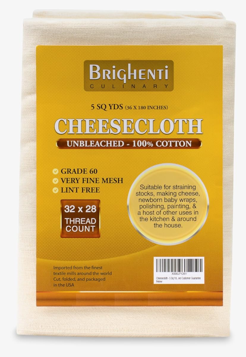 Brighenti Cheesecloth - 5 Yds - Grade 60: Very Fine Mesh - Unbleached, 100% Cotton is best for youALL CHEESECLOTH IS NOT THE SAME What to Look for in a Quality Cheesecloth: - Can it be washed and reused? - Does it have a consistent weave? - Is it made from virgin cotton or is it recycled material? - Is it free of bleaches and dyes that might contaminate foods or irritate sensitive skin? The Benefits of Using Brighenti Cheesecloth: Our cheesecloth is delicate enough to be used as a newborn baby wrap, yet strong enough to polish fine wood furniture. The Grade 60 mesh (32x28 tpi) makes straining whey and other food products possible without double or triple folding. The tight weave allows our cheesecloth to be washed and reused many times without loosing its shape or effectiveness. Typical Uses: Spice bags, cheese and wine making, canning, straining stocks, basting wraps for turkey or chicken, poaching fish, polishing fine wood furniture, newborn baby wraps, facial invigorating cloths. Why Brighenti Cheesecloth is different from other brands: - Sourced by the leading producer of hospital operating room bandages in the USA, so you are assured of the highest quality weave - Modern, state-of-the-art looms ensure a consistent weave without flaws or irregularities - Brighenti Culinary customer service is the absolute best Our No-Hassle Guarantee: If for any reason you are not 100% satisfied with this product, please contact customer service and we will immediately refund your purchase price – no questions asked. Don't wait for this sale to end! Go to the top of this page and click the ADD TO CART button before we return to our regular pricing.