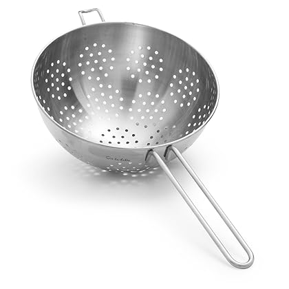 Sur La Table Colander with Wire Handle 2219.22.10 , 7¾", 7.75" is best for youDurably constructed and smartly designed with a pot lip and long handle, these colanders are great for resting on pots, and are easy to handle and transport. The rounded bottoms allow for easy draining over large pots or bowls. Best of all, stainless steel is non-reactive to foods. The double-wire handle makes hanging storage simple. Dishwasher safe.
