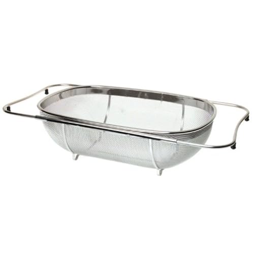 Norpro Expanding Over the Sink Colander with Base Frame is best for youHave you ever spilled food or burned your hands while juggling both a hot pot and a hot metal colander? With the Norpro over-the-sink colander, your hands are free to handle one task at a time--your sink stabilizes the stainless-steel mesh basket. Simply place the rubber feet on the sink edges, sliding the handles outward for a custom fit. The basket can be adjusted to hang directly under your faucet for rinsing and washing. Slip a pan or bowl underneath the free-hanging basket to catch drippings, to strain gravies and sauces, or to sift dry ingredients.