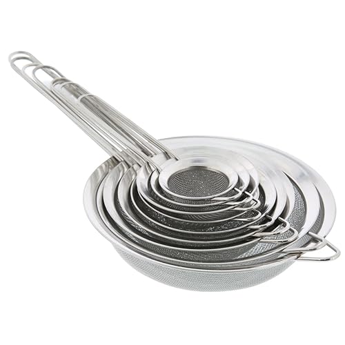 Fine Mesh Stainless Steel Strainers set, 9pc is best for youFrom straining tea leaves to sifting quinoa, these quality fine mesh stainless steel strainers will accomplish any task. Stainless Steel Fine Mesh Suited for all Ingredients Made with quality materials, these strainers are not only suited for the rigors of the kitchen, but are durable and dishwasher safe. Comfortable to hold and reliable in any situation, there's nothing they can't do. Graduated Sizes for Maximum Convenience With 9 sizes to choose from, a strainer is available for whatever job is at hand. Furthermore, with the looped handle designs, storage was never simpler. When not in use, simply hang the strainers, or rest them in pans or pots.