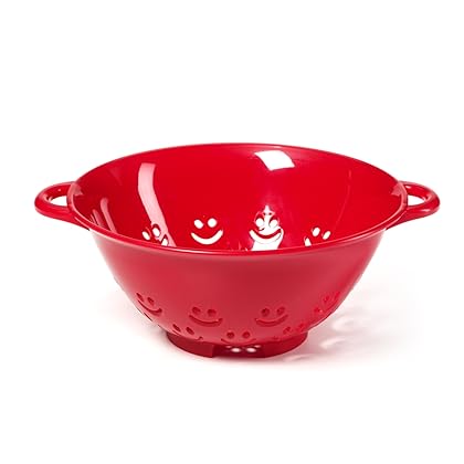 Kizmos Get Happy Colander (Red, 2.5-Quart) is best for youColor:Red Liven up your kitchen décor with the colorful and whimsical Kizmos Get Happy Colander. The colander is packaged individually. This colander is constructed of durable dishwasher safe plastic. Rinse and drain fruits and vegetables with the colander, which has feet for a stable base when sitting the colander in the sink or on a counter. The perforations in the colander are cut out in happy face shapes. The Get Happy Colander is available in several colors and sizes.