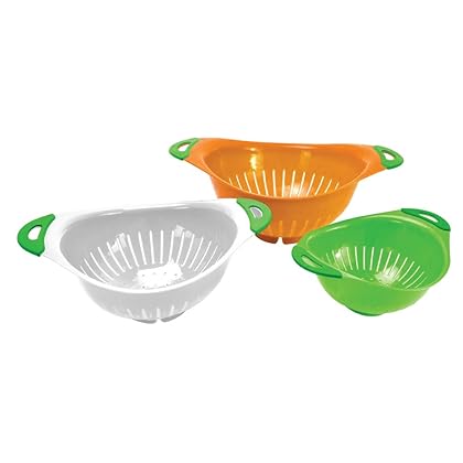 Sunkist Colanders-4.5, 2.2, 1.2 quart with softgrip handles, white/orange/green SAP2759 is best for youAdd some color to your kitchen with the Sunkist Plastic Colanders with Softgrip Handles. This set of 3 colanders features a raised base to keep contents clear of countertops and sink surfaces. Made of durable plastic, these colanders have softgrip handles for ease of use. Colanders come in 3 varying sizes (1.2 qt., 2.2 qt., and 4.5 qt.) and are ideal for cleaning fruits and vegetables or draining pasta. Hand wash is recommended. White/Orange/Green. Sunkist is among the top 50 most recognized brand names in the world. It is synonymous with high standards and a premium quality product.