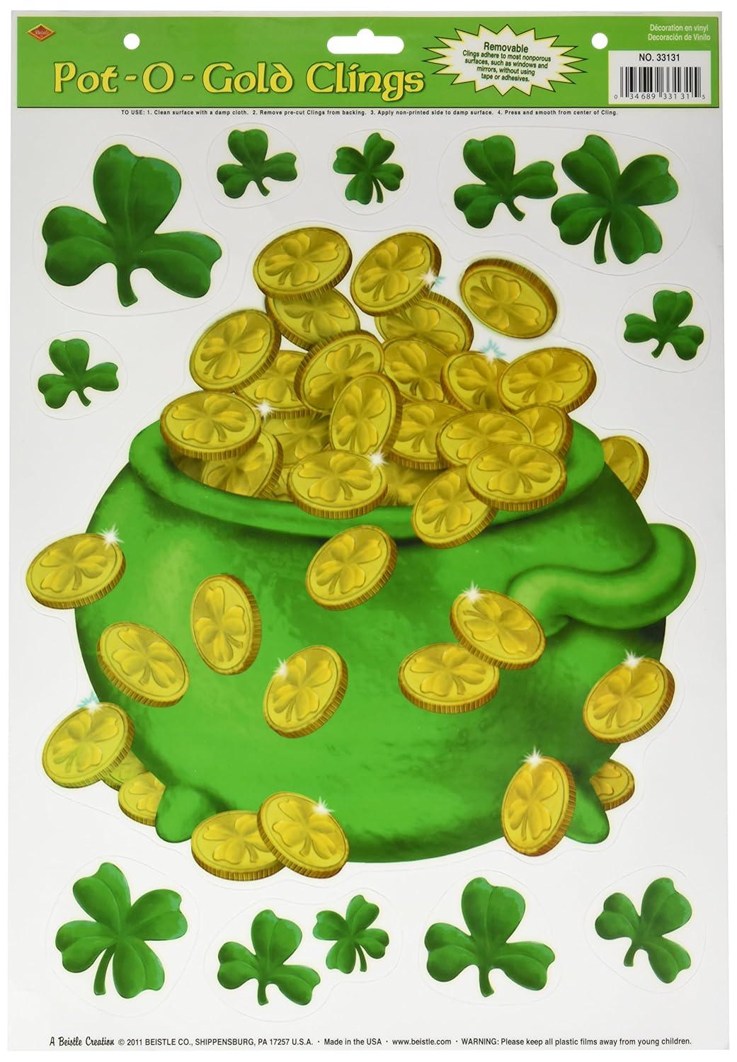 Beistle 33131 Pot-O-Gold Clings Sheet, 12-Inch by 17-Inch is best for youBeistle 33131 Pot-O-Gold Clings. 1 cling per sheet. This big pot of gold is a must have to hang up in a window for St. Patrick's Day! It is a green pot with lots of gold inside!.