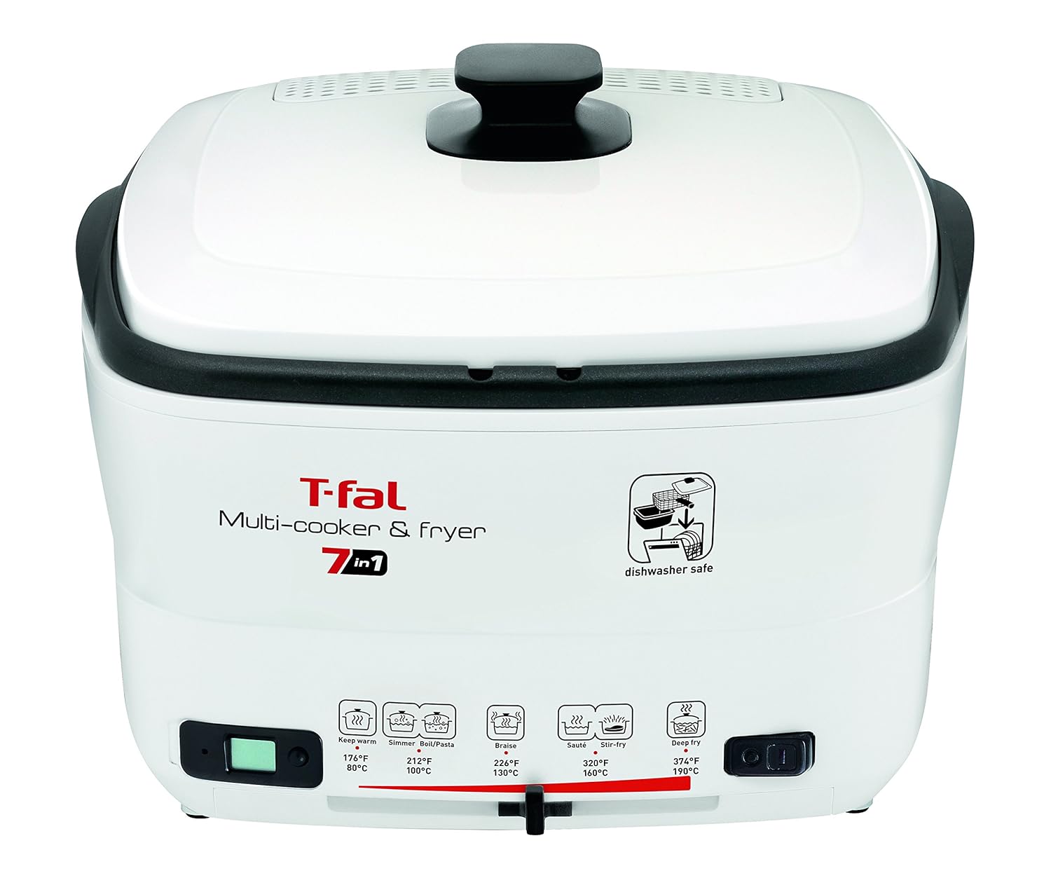 T-fal FR4900 7-in-1 Multi-Cooker and Deep Fryer with Nonstick Removable Bowl and Timer, 2.2 Pound, White is best for youThe T-fal 7-in-1 Multi Cooker & Fryer multitalented and versatile countertop product is an all-in-one system for performing countless cooking tasks, from sauteing, simmering, stirring, braising, boiling and deep frying and keep warm. With this versatile appliance you will now be able to prepare soups, risotto, French fries pasta. And an endless variety of meals from family dinners, and one-pot meals to party favorites thanks its large cooking capacity up to 2.2lbs! T-fal 7-in-1 & Fryer is easy to use with On/off switch and intuitive temperature control, and also features a removable audible timer you can take with you when you are away from the kitchen during the cooking session. Non-stick removable pot, deep-frying basket and lid are easy to clean and dishwasher safe for your convenience. T-fal exclusive Recipe book included.