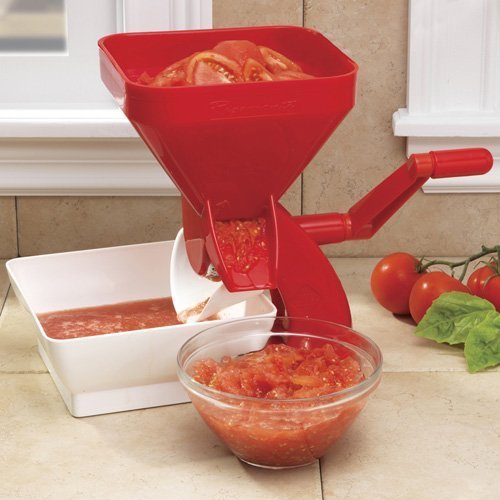 V562-01 Tomato Strainer, Red is best for youMake up quick batches of your favorite tomato puree. No peeling or coring. Skin and seeds are separately ejected, while smooth puree runs down the tray.